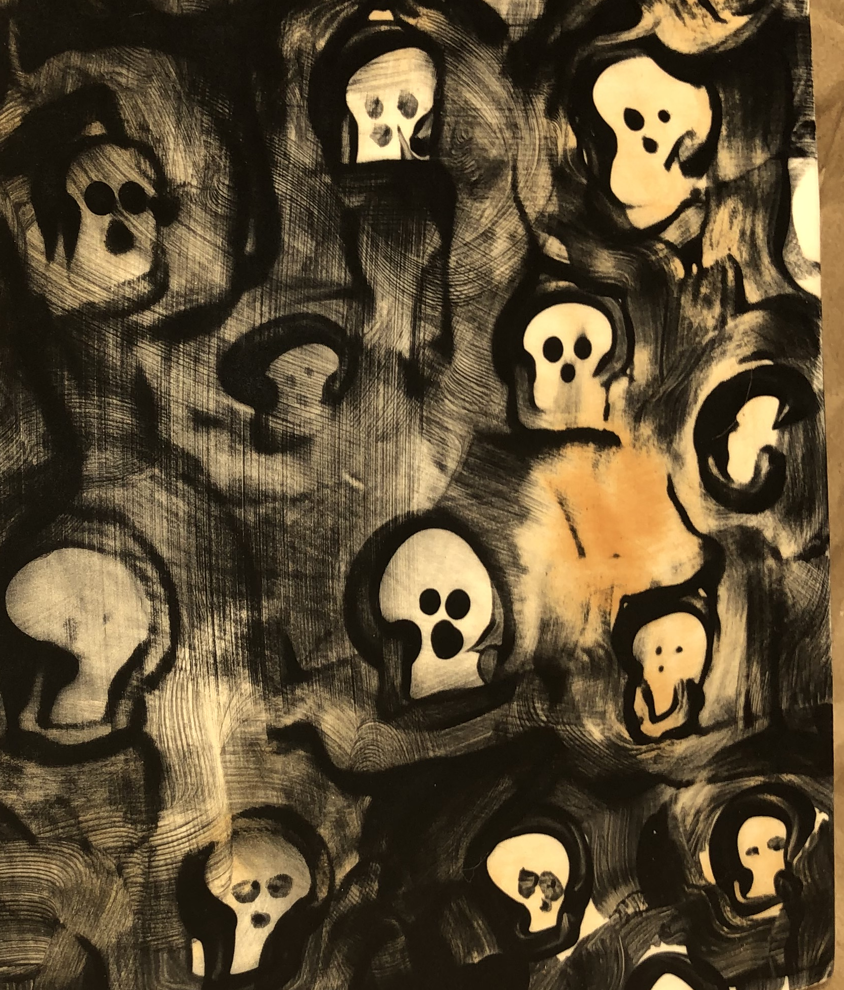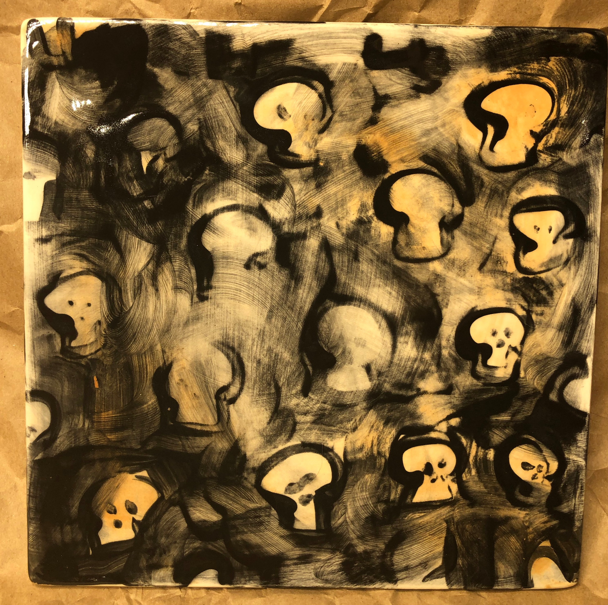 This is a set of four 8x8 inch plates covered with Saturday Morning Skulls. The kind of decoration that looks right at the horrors of the world and continues to munch on breakfast. The kind of plates that will always be slightly darker than your coffee. Classically dark form a distance with just a wee bit of foreboding if you actually clear your plate.